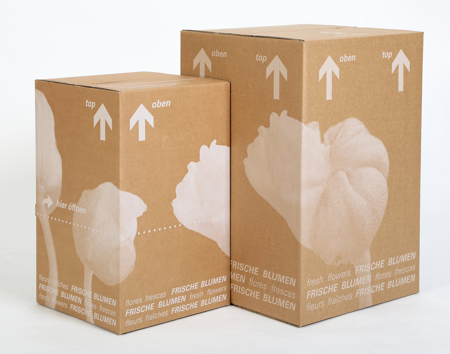 Der Blumenversandkarton erhält ein neues Design und ist jetzt in 2 Größen erhältlich. Die Handhabung wurde verbessert und die Blumenstraußhalterung stabiler gemacht.